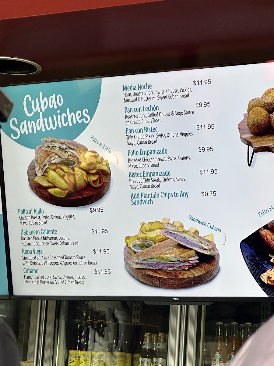 Garlic chicken steak, Swiss cheese, lettuce, tomatoes and grilled onions on Cuban bread. Served with plantain chips.